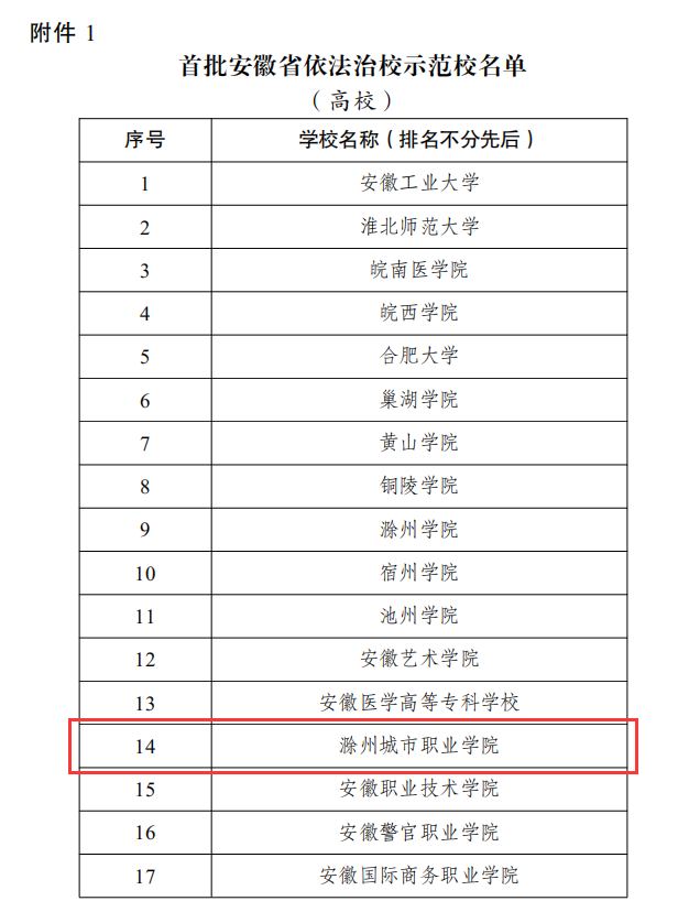 近日,安徽省教育厅正式发布《安徽省教育厅关于公布首批安徽省依法治校示范校名单的通知》(皖教秘政法〔2024〕30号),在各地各校积极创建和申报的基础上,经专家评审、集体评议和结果公示,认定17所高校、18所中小学校为第一批全省依法治校示范校,最终滁州城市职业学院成功入选!热烈祝贺!