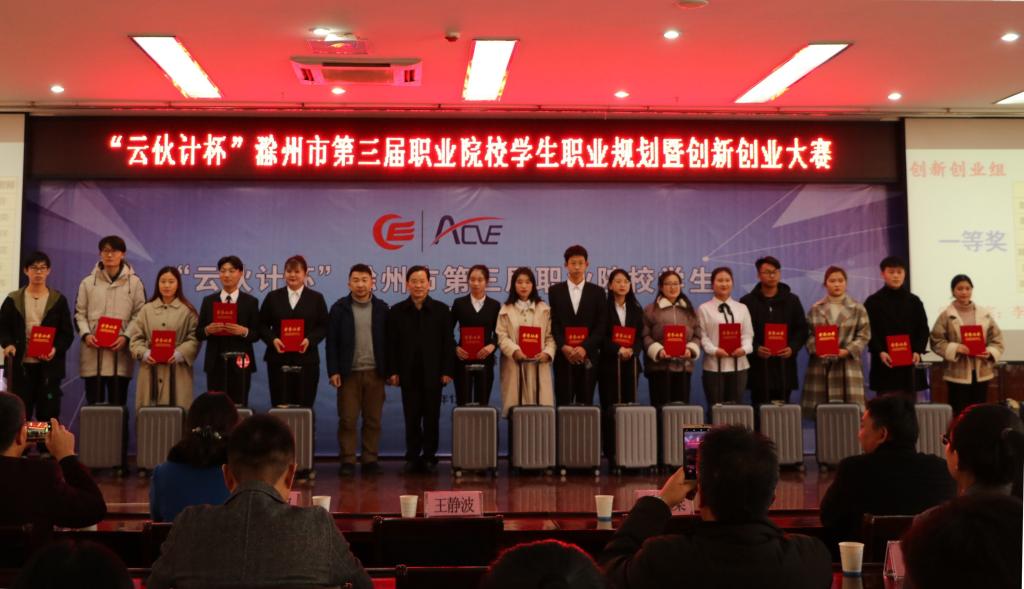 12月11日,由滁州市教体局和安徽滁州职教集团联合主办,beat365在线唯一官网承办的“云伙计杯”滁州市第三届职业院校学生职业规划暨创新创业大赛在beat365成功举办。学校党委书记、职教集团理事长李柱梁,市人社局副局长戴宗玉,市教育体育局副局长、职教集团副秘书长王莉,学校党委委员、校长助理、职教集团秘书长穆松,云伙计电子商务集团总裁王静波,学校招生就业处副处长、职教集团副秘书长周多道等领导莅临大赛现场观摩指导,并为获奖选手颁奖。