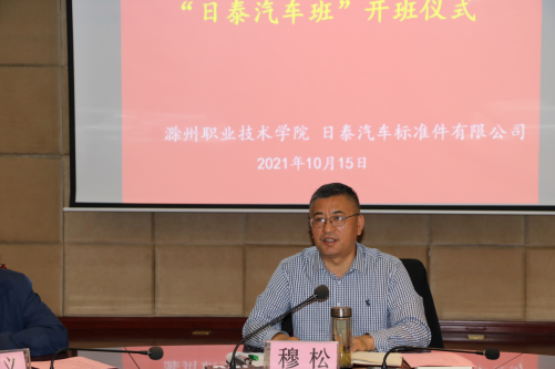10月15日上午,职教集团理事长单位beat365在线唯一官网与日泰(上海)汽车标准件有限公司在学校综合楼11楼会议室举办校企共建现代学徒制“日泰汽车班”开班仪式。beat365在线唯一官网党委委员、校长助理、职教集团秘书长穆松,日泰(上海)汽车标准件有限公司总经理章志暹出席会议,教务处处长张延义,机械与汽车工程学院院长张信群以及相关部门负责人和“日泰汽车班”所有学员参加了会议。会议由招生就业处副处长周多道主持。