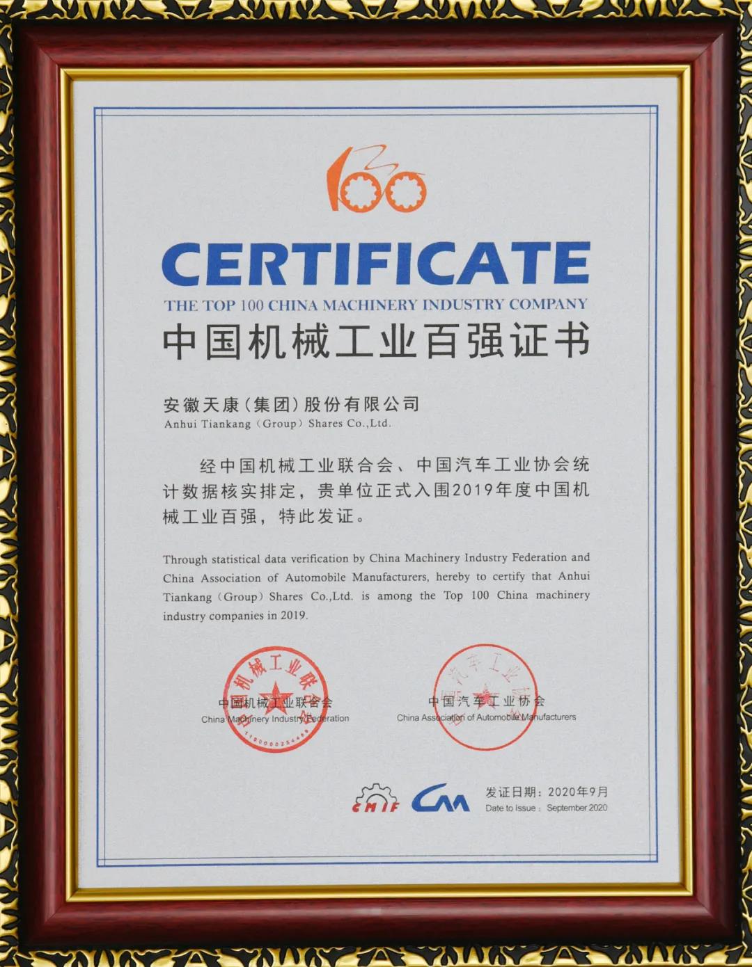 滁州职教集团成员单位安徽天康集团荣获2019年度中国机械工业百强