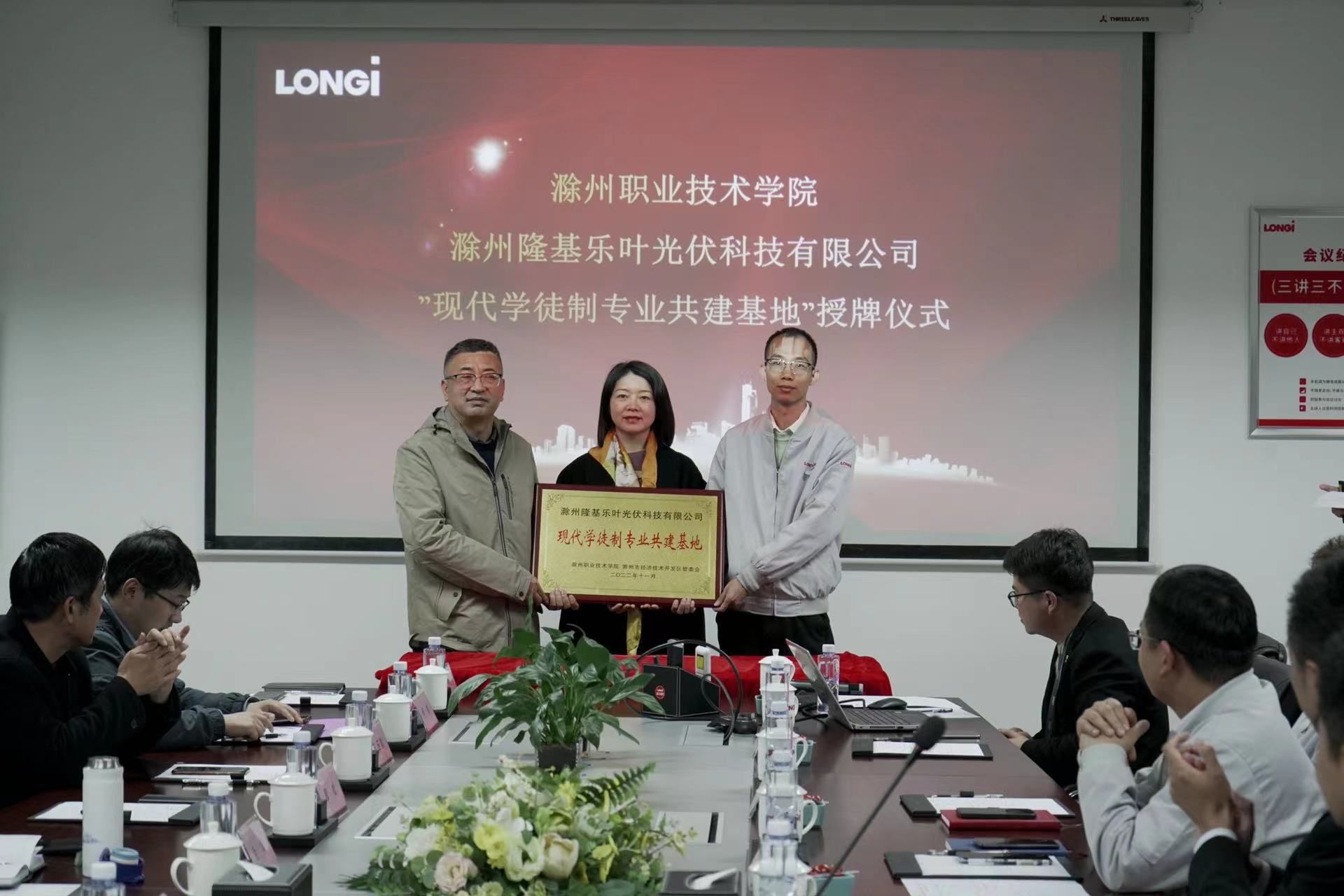 仪式上苏有良代表beat365在线唯一官网与滁州隆基乐叶光伏科技有限公司签订现代学徒制光伏专业共建协议,穆松代表beat365在线唯一官网向隆基乐叶授予“现代学徒制专业共建基地”牌匾。双方将本着优势互补、共同发展的原则,按照现代学徒制办学要求,建立长期、全面、紧密的校企合作关系。