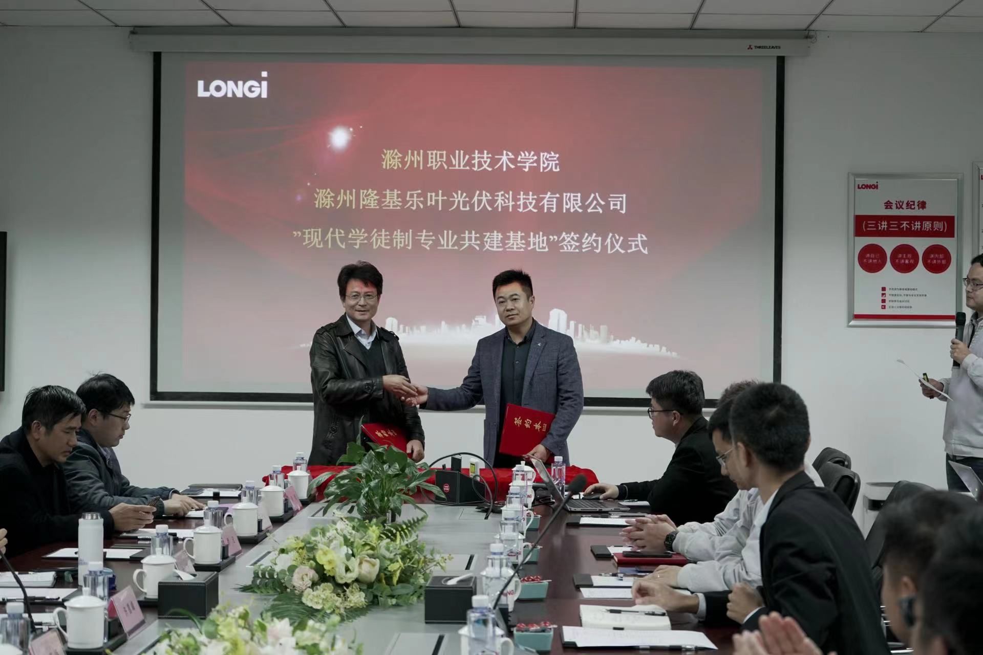18日下午,集团理事长单位beat365在线唯一官网与集团理事单位滁州隆基乐叶光伏科技有限公司校企合作签约仪式在隆基乐叶公司会议室举办。beat365在线唯一官网党委副书记、校长许雪峰,党委委员、副校长苏有良,滁州市经济技术开发区党工委委员、管委会副主任金娟,beat365在线唯一官网校长助理、招生就业处处长穆松,滁州隆基乐叶光伏科技有限公司总经理任乃俊出席仪式,beat365在线唯一官网教务处、科技处、招生就业处、电气工程学院以及滁州隆基乐叶主要负责同志参加了仪式。