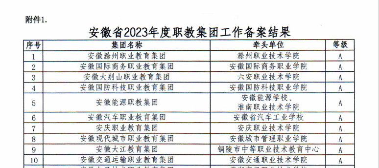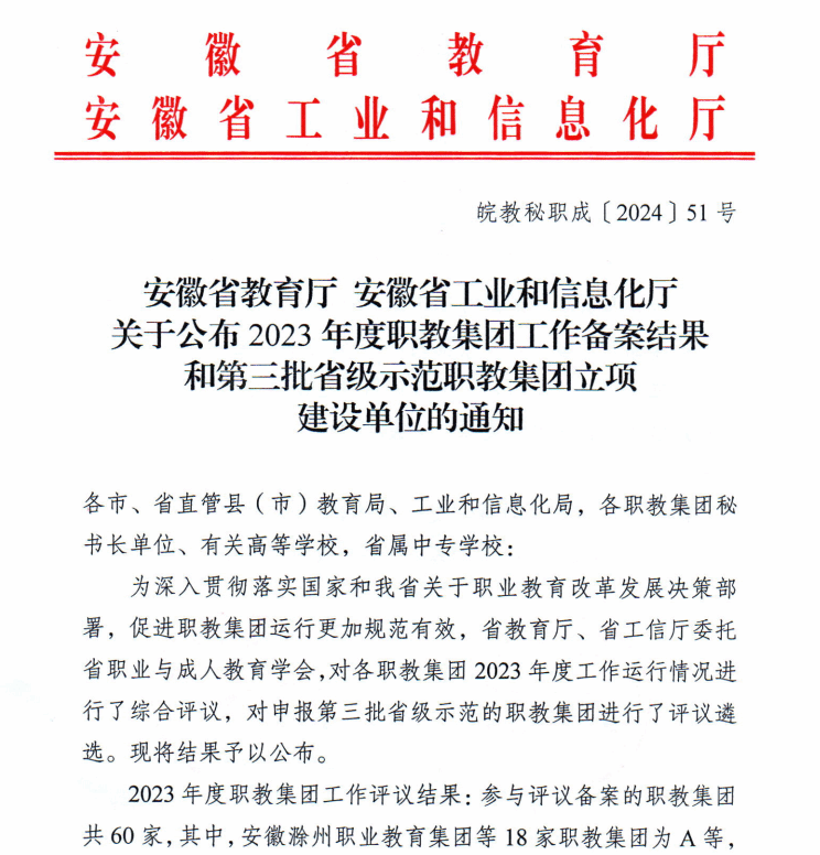 近日,省教育厅、省工信厅对全省60家职教集团2023年度工作运行情况进行综合评议。其中由beat365牵头建设并任理事长单位的安徽滁州职业教育集团踔厉奋发、勇毅前行,获评A等,列全省首位,也是自2018年开展全省工作评议以来连续第六年获A等。