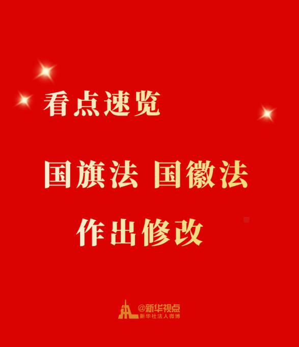 10月17日,十三届全国人大常委会第二十二次会议经表决,正式通过《中华人民共和国国旗法(修正草案)》及《中华人民共和国国徽法(修正草案)》。新修改的这两部法律将于2021年1月1日起施行。