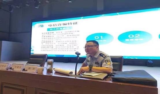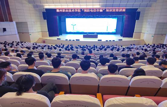 活动邀请滁州市公安局南谯分局党委委员、副局长兼龙蟠派出所所长嵇磊主讲。活动开始时,嵇磊局长先向师生科普了诈骗的常见形式,通过播放宣传片及对真实案例的讲解使广大师生了解诈骗所产生的一系列危害。诈骗的常见形式包括刷单、网上招嫖、网络贷款以及冒充客服诈骗等,经过对一系列真实案例的剖析,对诈骗犯罪者及被骗者心理的分析,让广大师生对电信诈骗的手段及流程有了更深入的认识。活动最后,嵇磊局长表示遇到电信诈骗要保持良好的心理素质,及时向公安机关寻求帮助,避免造成更大的财产损失。