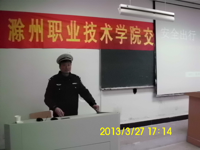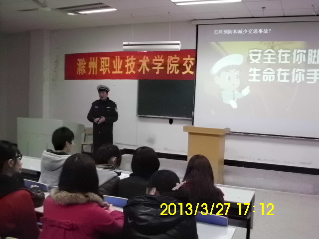 2013年3月27日,保卫处邀请了滁州市交警支队二大队郑涛指导员来院做交通安全法制讲座,经贸系200余名师生参加了讲座。郑指导员在讲座中列举了大学生在交通出行中发生的交通事故案例,用视频、图像的形式给同学们分析发生交通安全事故的原因和如何预防交通安全事故的发生等,教育同学们要遵守交通规则,提高交通安全意识,珍爱生命,共创和谐幸福家园。(文/图 保卫处)