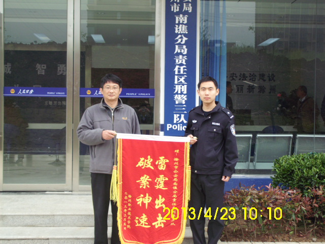 ,学院保卫处前往滁州市公安局南谯分局责任区刑警三队赠送锦旗,感谢他们破案神速,为我院追回被盗空调三台,挽回了经济损失。