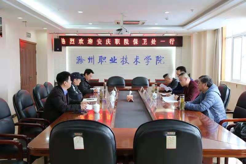 2021年3月17日,安庆职业技术学院保卫处李五一处长来校考察交流。校安全保卫处处长贺建邺热情接待,安全保卫处治安科王煜康、王伟参加座谈。