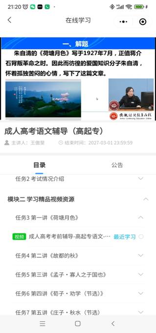 2、直接点击您要学习的课程图标,例如在这里,可以继续学习《成人高考语文辅导(高起专)课程》(如图12所示)。则进入《成人高考语文辅导(高起专)课程》资源界面。