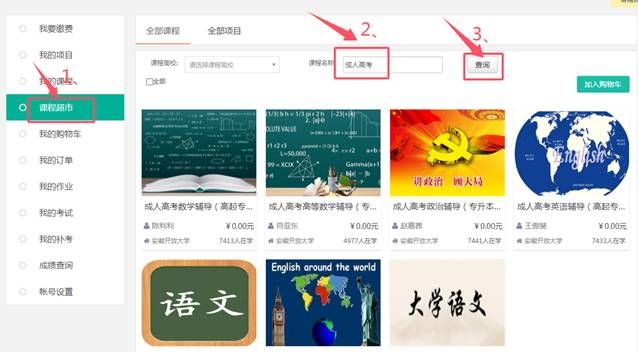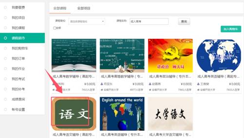 1、点击左侧的“课程超市”按钮,然后在右侧里显示全部课程。(如图7所示)