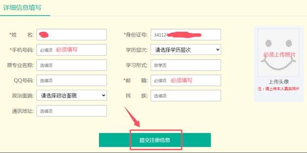 打开“详细信息填写”页面(如图3所示),必须填写手机号码及邮箱,上传个人证件照后,然后点击“提交注册信息”按钮即可注册成功。
