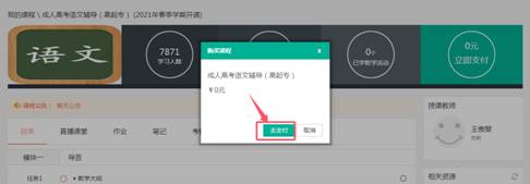 6、您若是想看课程资源,先点击右侧的蓝色背景“0元立即支付”按钮(如图9所示),则弹出“购买课程”对话框(图10所示)。