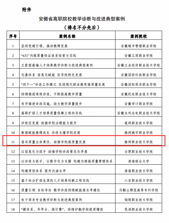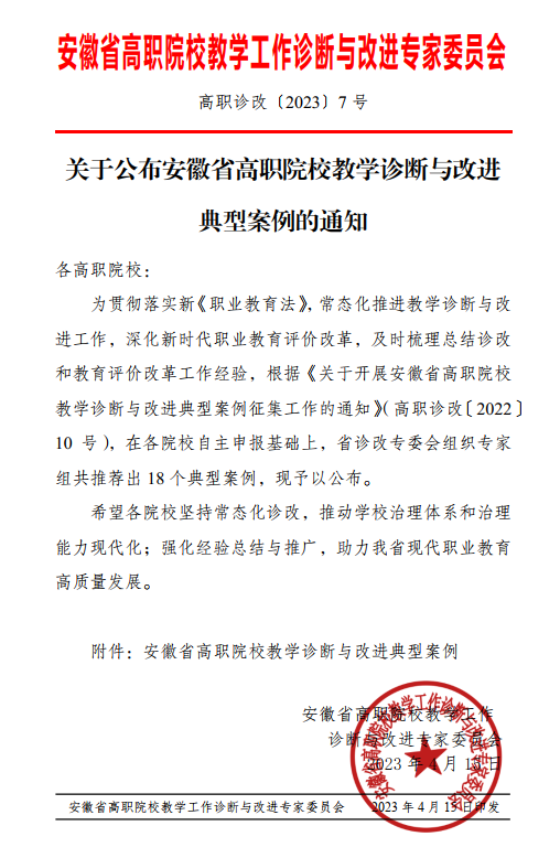 近日,安徽省高职院校教学工作诊断与改进专家委员会公布了《关于公布2023年安徽省高职院校教学诊断与改进典型案例的通知》(高职诊改〔2023〕7号),beat365报送的《落实质量主体责任,助推学校高质量发展》案例入选。
