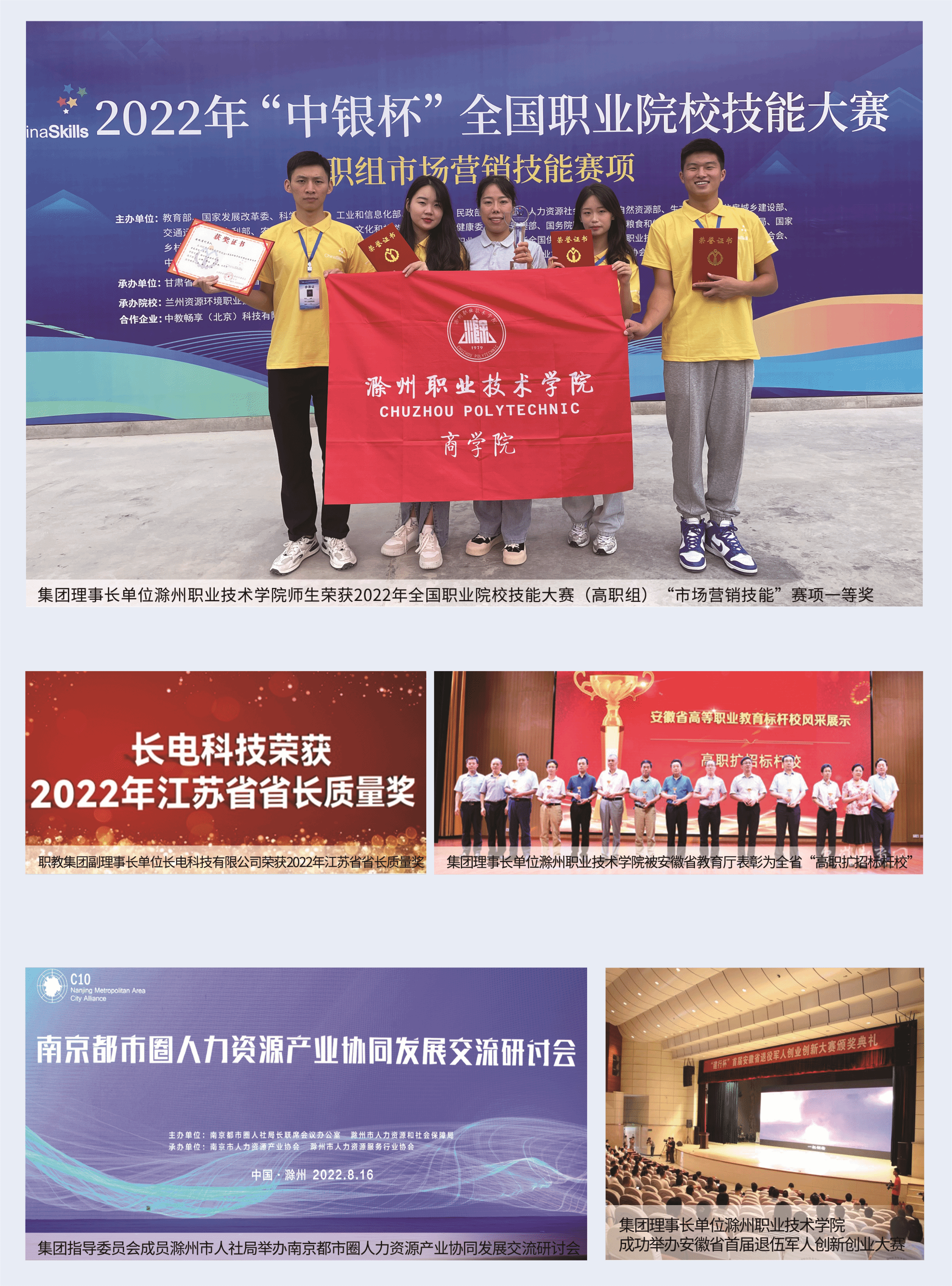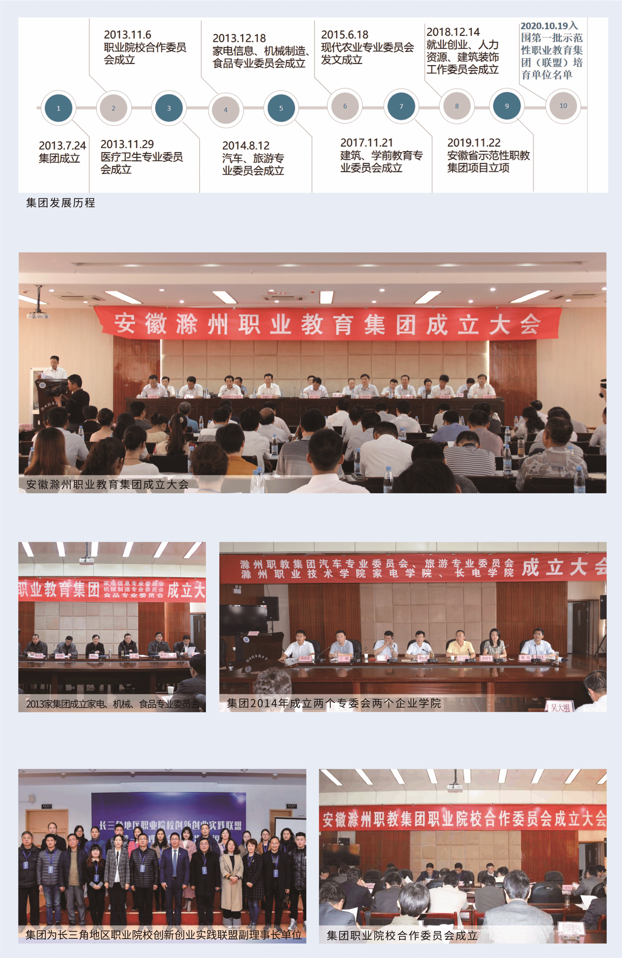 集团成立至今,一直受到滁州市委市政府的高度重视。在滁州市委市政府主导下,在滁州市经开区、中新苏滁高新区、市教体局等部门的指导下,职教集团逐步形成政、行、企、校充分参与,协作、稳定、高效的运行机制,呈现出指导委员会与集团之间、牵头单位与行业企业之间、二级机构和集团成员单位之间你中有我、我中有你的工作格局。集团2019年获批“安徽省示范性职业教育集团立项建设单位”,2020年入围全国“第一批示范性职业教育集团(联盟)培育单位名单”。在集团成员的共同努力下,已初步建成经科教联动、产学研结合、校企所共赢的区域现代职业教育体系。