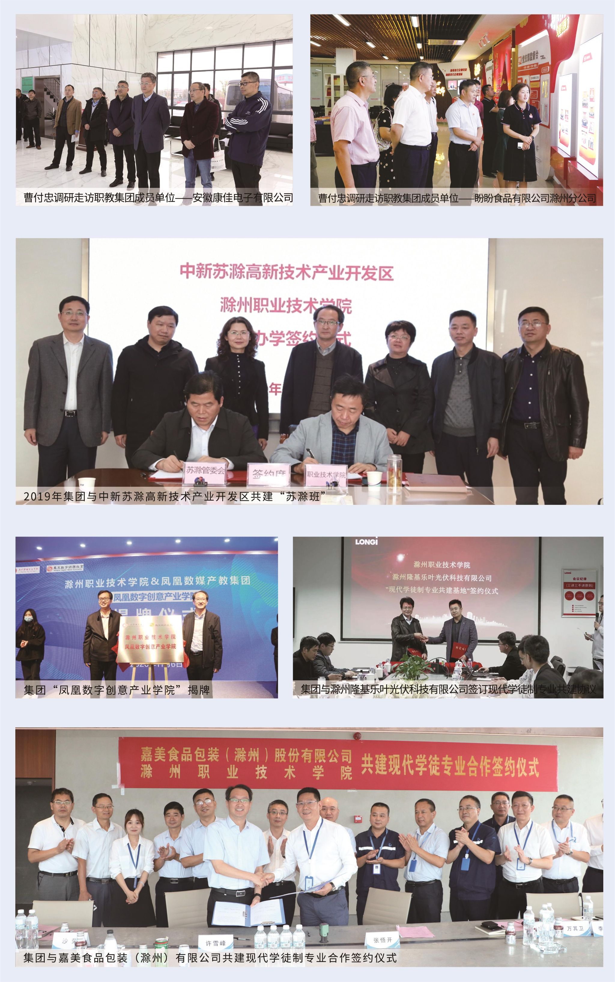 集团还已成功举办第四届“产教融合校企合作对接会”,与124家企业签订了产学研合作协议,评选出博西华家用电器有限公司、金鹏控股集团有限公司、滁州惠科光电科技有限公司、星恒电源(滁州)有限公司、滁州隆基乐叶光伏科技有限公司、狮门影视广告传媒有限公司等10家学生满意的实习企业和20名优秀实习学生。