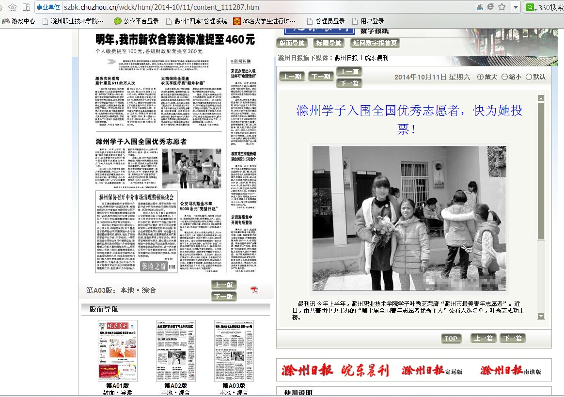 10月9日开始,院团委及各系团总支通过多种渠道对叶秀芝同学的事迹进行了宣传、报道,很多团员青年自发进行微信投票,截止发稿,叶秀芝同学在40名候选人中以1152票排名第一,领先第二名80余票。10月11日,皖东晨刊报道了叶秀芝同学的事迹。
