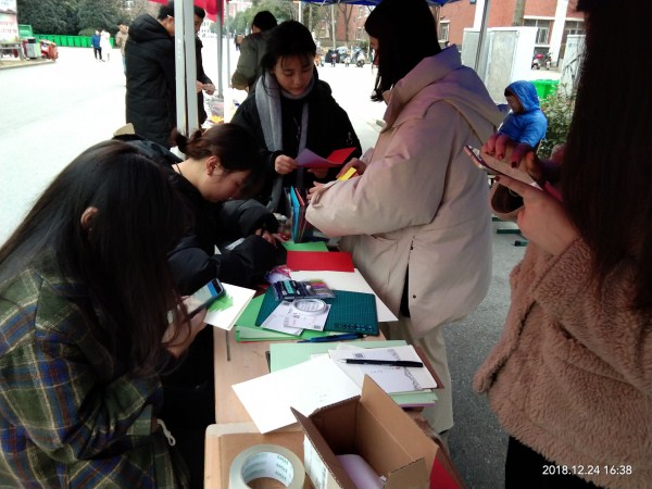 在活动期间红韵镂艺社成员在活动摊点,社员们向来往学生介绍本次活动,让更多的同学能自己尝试制作圣诞贺卡,努力让参加活动的每个人都能够将自己的情感传递出去,让这个冬天温暖着大家的心。既有利于促进同学们情感的抒发,也能为大家的校园生活增加更多趣味。