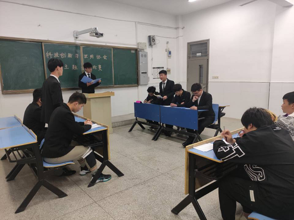 科技创新与发明协会与4月18日晚六点半在致新楼5103开展了大学生“科技论道杯”主题辩论赛。本场比赛共六只支参赛队伍参加,每队各四名队员。在主持人一声“开始”后,第一组由“科技发展会抑制还是促进人类的全面发展”为辩题开始辩论。首先由正反方一辩各做限时为两分钟的陈词。正方一辩以“科技的发展会抑制人类的全面发展”为起点做出陈诉。反方一辩则围绕着“科技的发展会促进人类的全面发展”这一主题陈诉他们所搜集的材料。紧接着正方二辩(三辩)和反方二辩(三辩)对自己的论点加以补充并向对方提出了问题。在双方一辩回答之后,比赛进入了最精彩的“五分钟自由攻辩”环节。在此期间正反方四辩对己队的观点做了总结并在乱斗环节结束后发表总结陈词。第一组辩论结束后由裁判打分交给后台工作人员统计。