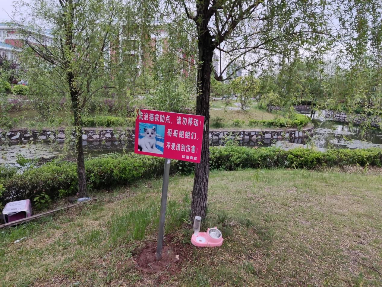 在活动初期,爱心社社员在校园里向大家宣传爱护小动物,呼吁大家不要伤害小动物。大家在经过校园巡视、调研后,确定了几个校内流浪猫经常聚集的地方。社员们将自制的移动猫窝、装满猫粮和水的猫盆放置好,并定期向猫盆里投放猫粮。最后,协会成员在校园14号楼旁边小池塘、图书馆旁边、食堂北门马路对面处分别树立了“流浪猫救助点,请勿移动”的警示牌。