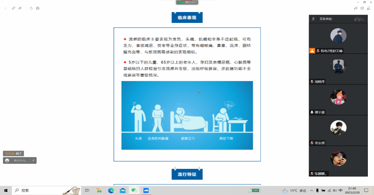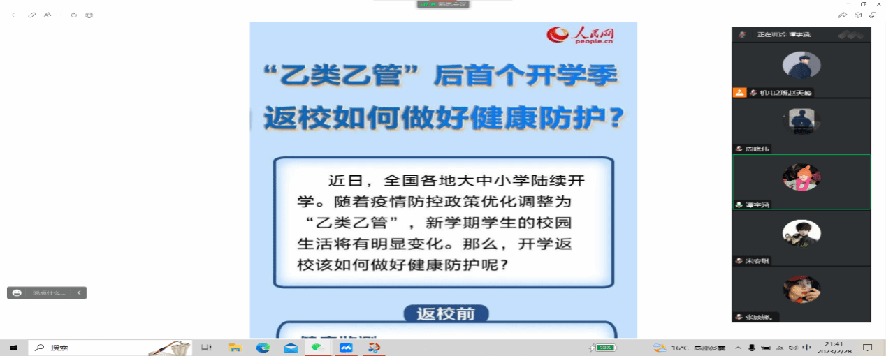 2月28日晚上,beat365在线唯一官网科技发明与创新协会开展“警惕甲型流感 ,预防传染病”主题线上会议。通过此次会议,希望同学们增强自觉预防疾病的意识,养成爱干净、讲卫生的健康习惯,共同营造一个安全洁净的校园环境。协会会长赵天峰同学向大家普及甲型流感小知识,介绍如何做好流感预防,以及感染甲型流感如何应对等防控知识。会议中社员们不仅进一步了解了甲型流感的特点,知道了甲型流感的传播途径,还对流感和普通感冒的区别有了一定的认知。会议结束后社团成员们还就流感的治疗原则、流感的消毒以及预防的基本常识进行了自主学习。