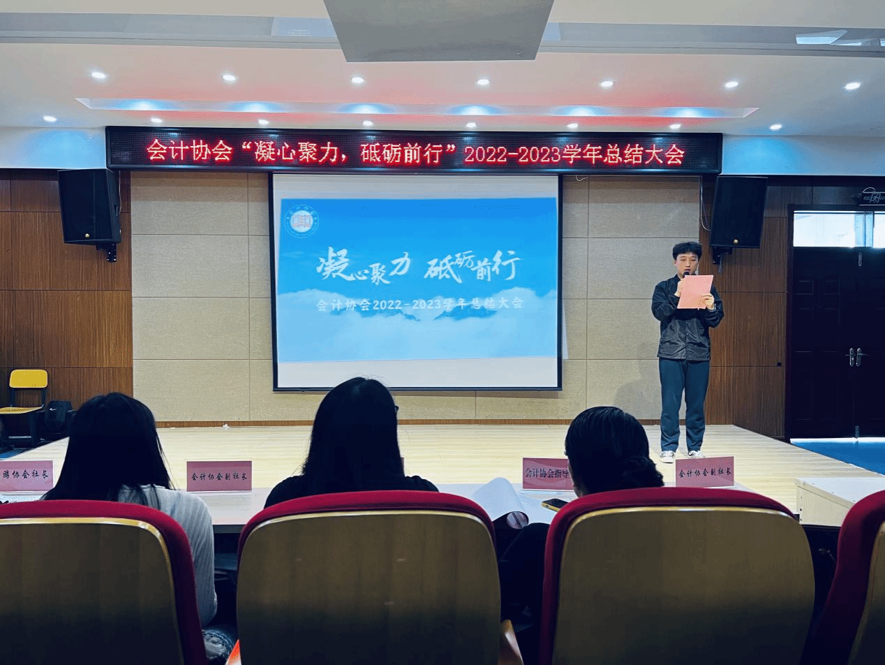 大会伊始,由会计协会优秀社团干事代表武雪晴同学及优秀社员代表张功孝同学上台作个人工作总结及收获感悟。随后,社长陈玉进行本学年社团工作总结,通过一张张PPT和一段视频带大家回顾这一学年的工作轨迹。一纸聘书,一份责任,从去年十月的迎新纳新,到今年五月的总结大会,通过不懈的努力和认真的工作,协会也取得了可喜的成绩。活动最后,陈晓鸣老师作总结发言,对社团在这个学年的工作成绩给予了肯定,正是大家的共同努力,才有了今天社团的进一步成长,同时希望协会的明天会更好!