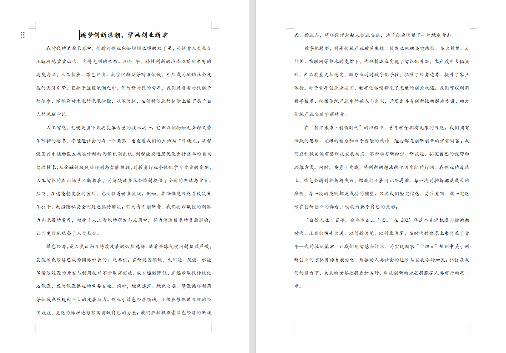 “智汇未来·创领时代”创新创业征文比赛自启动以来,迅速点燃全校创新热情,共吸引来自各个学院的80份参赛作品。参赛学生立足人工智能、绿色经济与数字化转型三大前沿领域,提交了兼具科技含量与人文关怀的创新方案。文章字里行间迸发着青年智慧的火花,展现了新时代学子“破界创新、躬身实践”的担当精神。