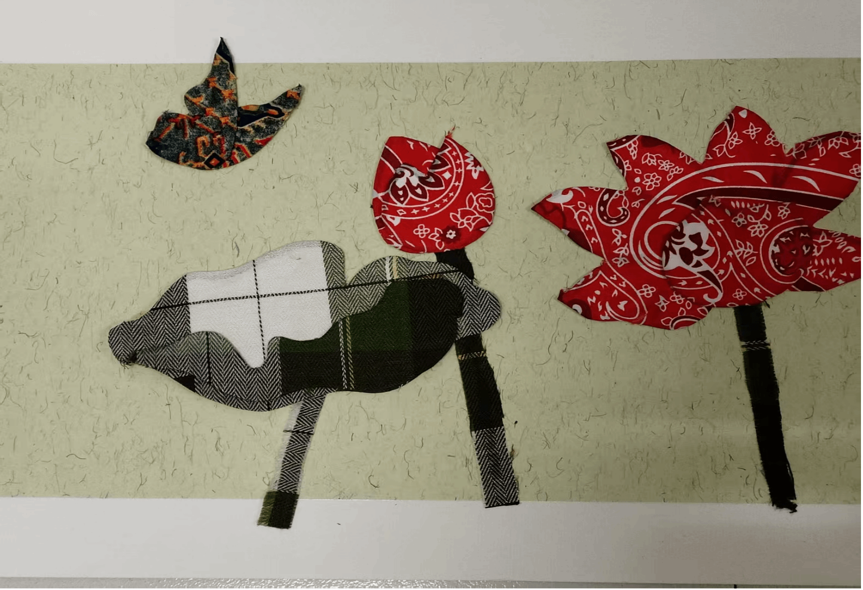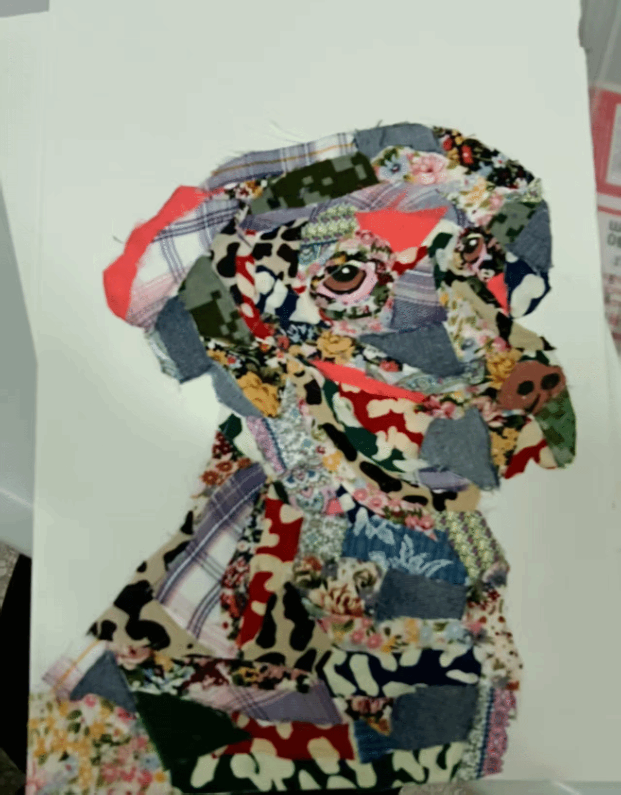 布贴画本质上是一种利用废弃布料拼贴出一副作品,手工爱好者可以在纸上画出好看的图案,再根据需要的形状在废弃的布料上裁剪出来,用布料专用胶粘上去。同学们根据自己的想象创作出了很多好看的作品。