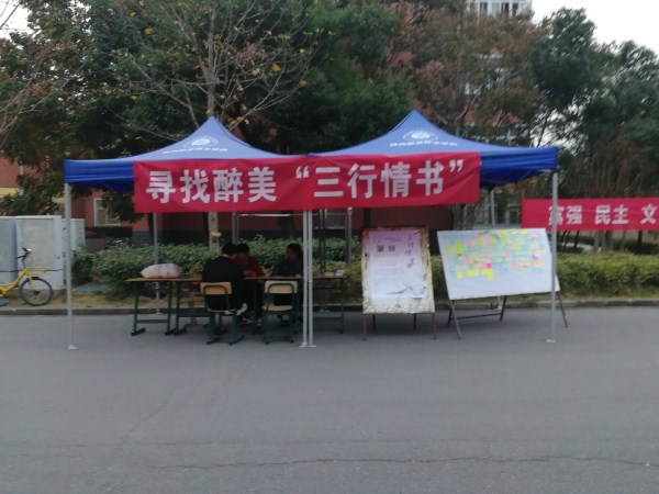求是青年社举办的“寻找醉美三行情书”于11月19日拉开帷幕,所谓的三行情书是用三行字来表达你的爱,这便是“三行情书”。年轻人用简练精致的三行语言表达对情侣的告白,祝福、牵挂以及对往事的追忆。 活动过程中虽然伴着凛冽的寒风,但同学们的热情似火,写下的三行情书更是温暖入心。