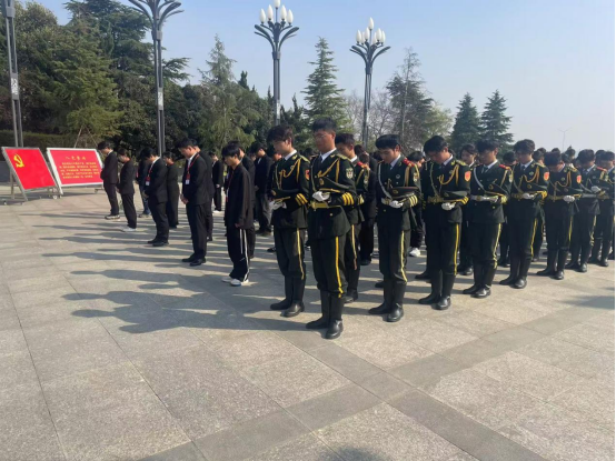 青山不老映丹心,苍松有信伴忠魂。一枝白菊饱含对烈士的崇高敬意和深切缅怀,学员们整齐列队,向纪念塔献花。献花后全体学生肃立于庄严的纪念碑前,向为民族独立、人民解放英勇献身的革命先烈默哀致敬。
