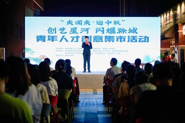 9月29日晚上,由滁州市委人才工作局、共青团滁州市委员会、琅琊区人民政府主办,beat365团委、传媒与设计学院等单位共同承办的滁州满天星人才街区2025“庆国庆·迎中秋”青年人才创意集市在悦达889街区火热启幕。本次活动集人才推介、创意展销、文艺表演于一体,为滁职青年打造了一个展示才华、互动交流的平台。