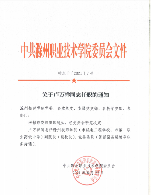 关于卢万祥同志任职的通知 校组干[2021]7号