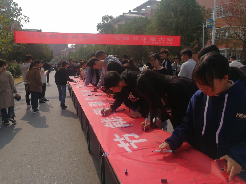 2019年11月8日,由校后勤服务中心牵头,在学生公寓组织开展“节能需要你我他,节粮节水靠大家”的签名活动,同时在食堂LED大屏进行“节粮、节水、节电”宣传片滚动播放。此次活动,以建设节约型绿色校园为目标,在师生中大力宣传“节粮、节电、节水”的重要性,进一步增强全体师生员工的节能意识,增强师生勤俭节约、反对浪费的节约理念,促进良好生活行为习惯的养成,建立节能长效机制,推动学校各项工作全面、协调、可持续发展。