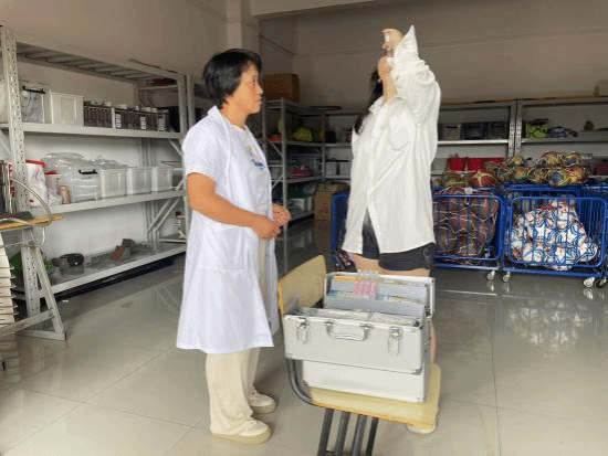 为确保体测工作安全有序推进,健康驿站专业医生事前准备了急救箱等急救药品,在测试现场设置临时医疗点,随时待命,实现突发情况4分钟内响应处置。
