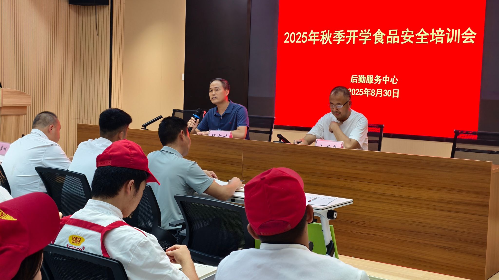 为全面做好2025年秋季学期开学食品安全工作 。8月30日下午,后勤服务中心在一站式学生社区报告厅组织开展2025年秋季开学前食品安全专题培训与考核。各校内餐饮企业项目负责人、现场管理人员、食品安全总监、食品安全员、食材采购人员、仓储管理人员、清洗消毒人员、各档口负责人,后勤餐饮科人员等60余名关键岗位人员参会。后勤服务中心顾宏才主持培训,后勤餐饮管理科王书籍老师进行培训。