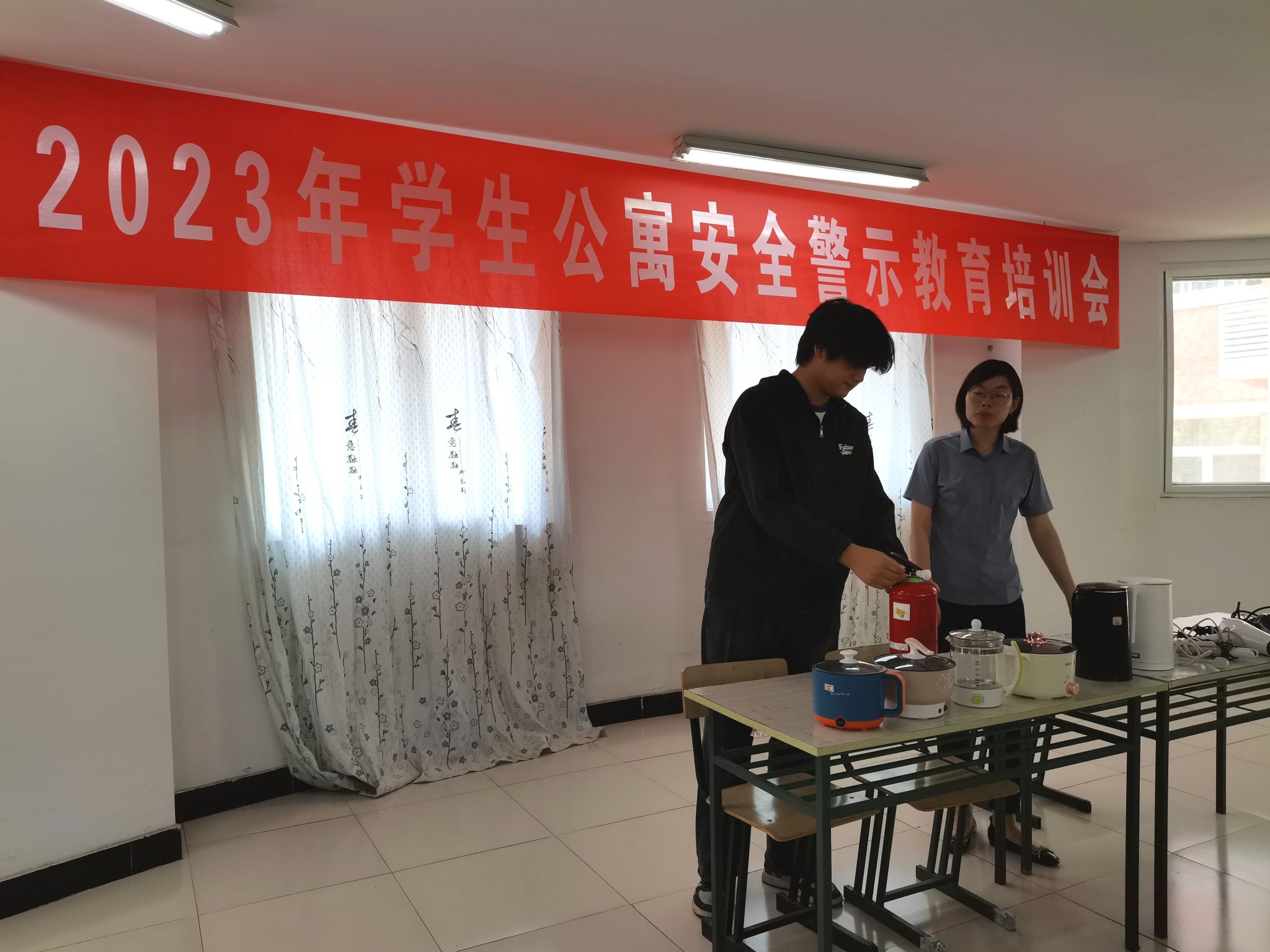 学生公寓是人员密集场所,安全责任重于泰山,此次培训的重点是让学生提高思想认识,加强安全意识。培训结合学生公寓日常检查中发现的私拉乱接、使用违章电器、宿舍抽烟等隐患逐一讲解,认真分析存在的安全风险。会上展示了学生公寓检查没收的部分违章电器,告诫学生违章电器的危害,并举例高校发生的违章电器引发的安全事故,让学生更加直观地感受违章电器的危害性。随后,通过与学生互动的方式对宿舍内发生火情如何进行自救等方面进行培训。最后,张茂丹呼吁参会学生代表以身作则,带动身边的同学一起做到,在宿舍不使用违章电器、不私拉乱接、不在宿舍抽烟,爱护消防器材,共同创建一个安全舒适、文明和谐的校园环境。