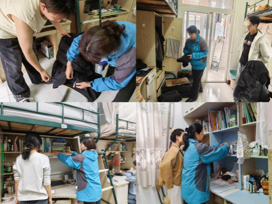在“内务小课堂”环节,宿管阿姨深入内务较差的寝室现场示范。从如何叠出标准的“豆腐块”被子,到合理收纳衣物、整理书桌,阿姨们进行了细致入微的讲解与演示。展示如何利用有限的空间进行高效收纳,让同学们收获满满。同学们围在阿姨身边,不时提出自己在整理内务时遇到的问题,阿姨们一一耐心解答,还鼓励同学们动手实践,现场学习氛围浓厚。