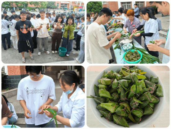 活动现场,粽叶、糯米、红枣等食材和包粽工具早已整齐摆放,空气中弥漫着阵阵粽香。活动伊始,经验丰富的“包粽能手”们化身“民俗老师”,热情地向同学们示范包粽子的技巧,耐心讲解每一个步骤的要点。同学们围在桌前,目不转睛地学习,随后纷纷动手尝试。欢声笑语回荡在整个活动现场。经过大家的共同努力,一盘盘饱满紧实的粽子摆满桌面。这些凝聚着劳动与温情的粽子,不仅是端午传统美食,更成为了后勤服务人员与学生之间情谊的纽带。活动结束后,将包好煮熟的粽子分送给宿管员、保洁员及部分学生,让他们感受到节日的温暖。