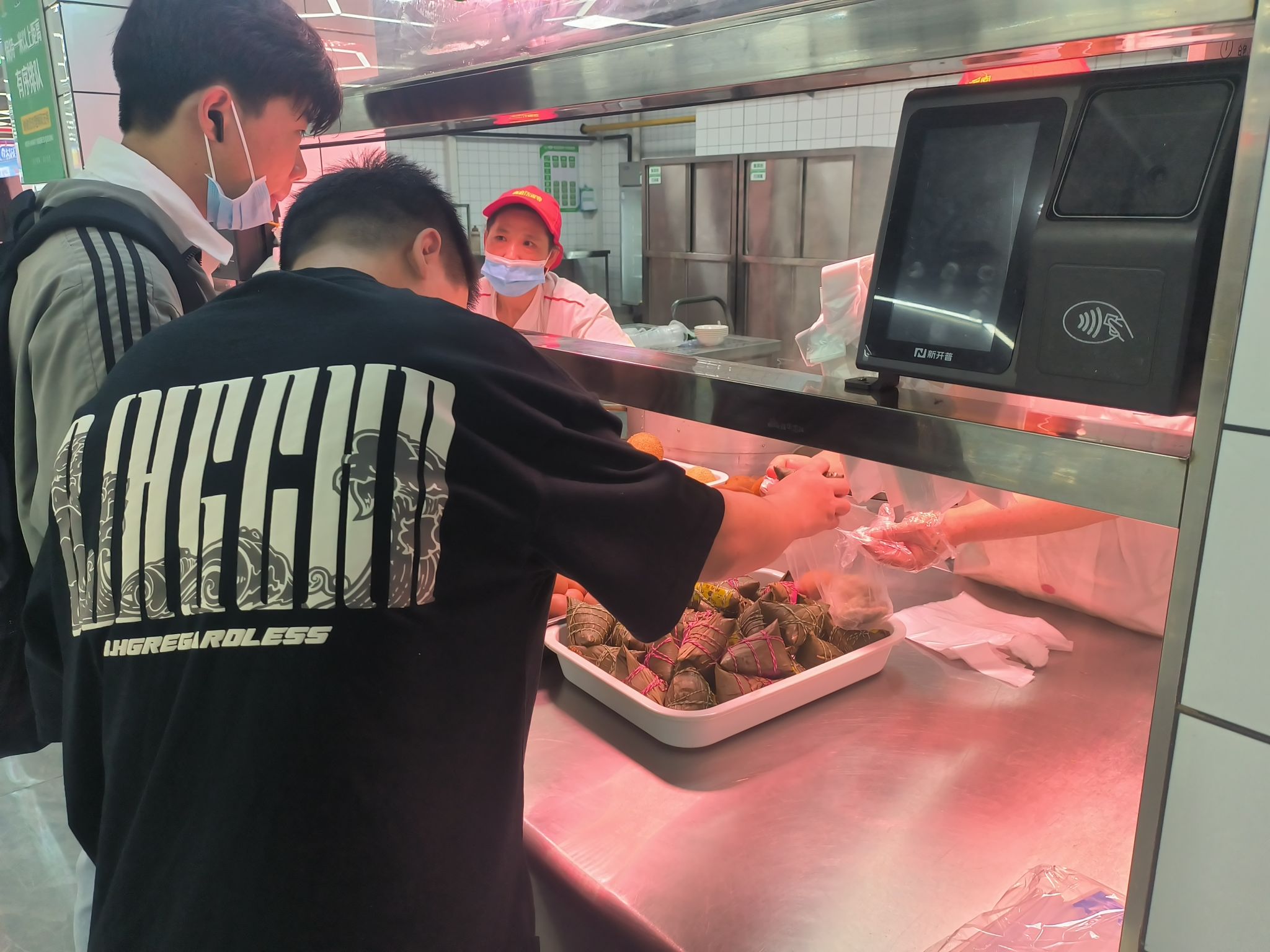 食堂现场,学生们在餐厅秩序井然的领取用餐,食堂工作人员热情的发放粽子和鸡蛋,并送上节日的祝福。现场洋溢着浓厚的节日氛围,同学们十分感动。