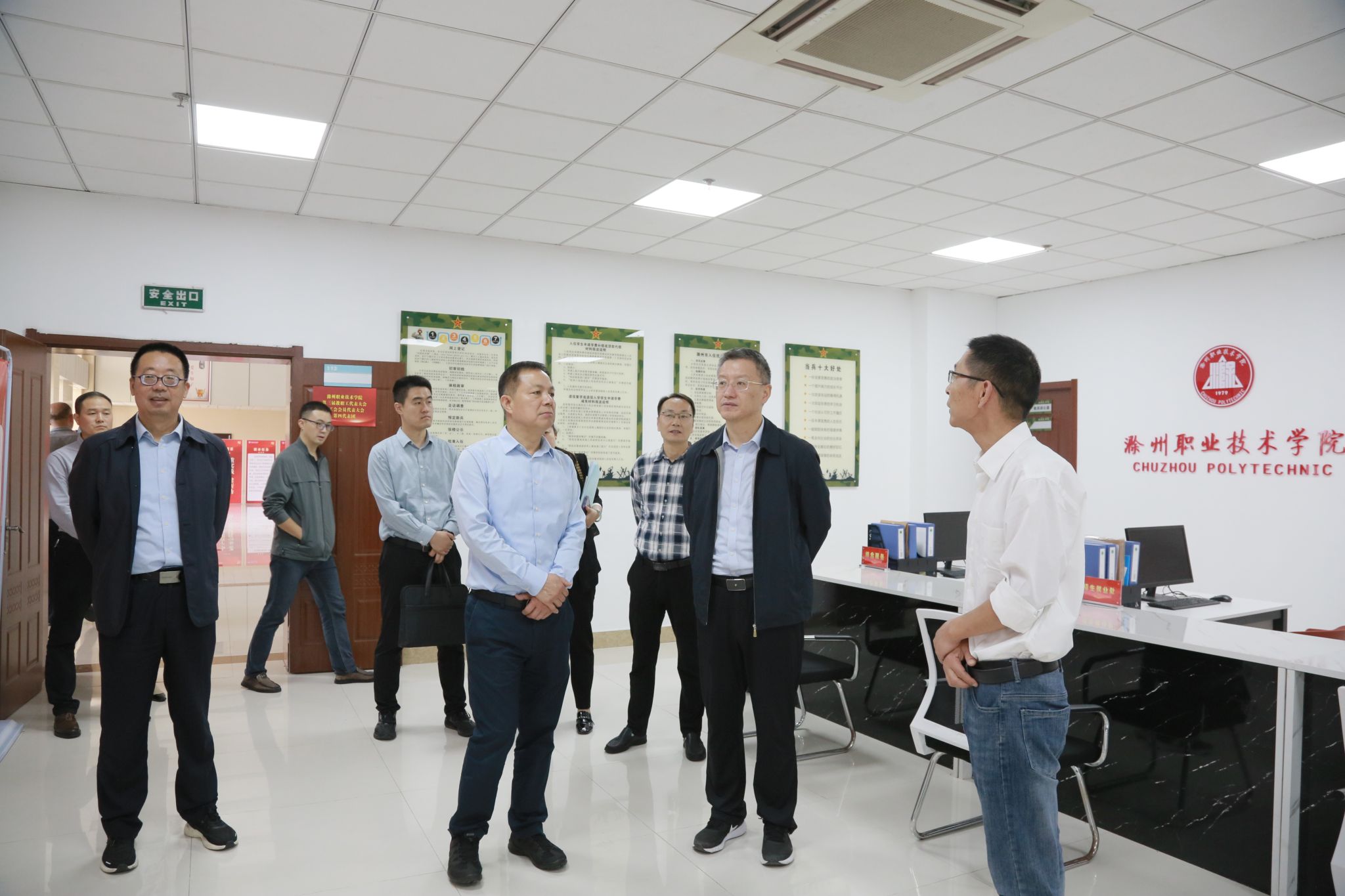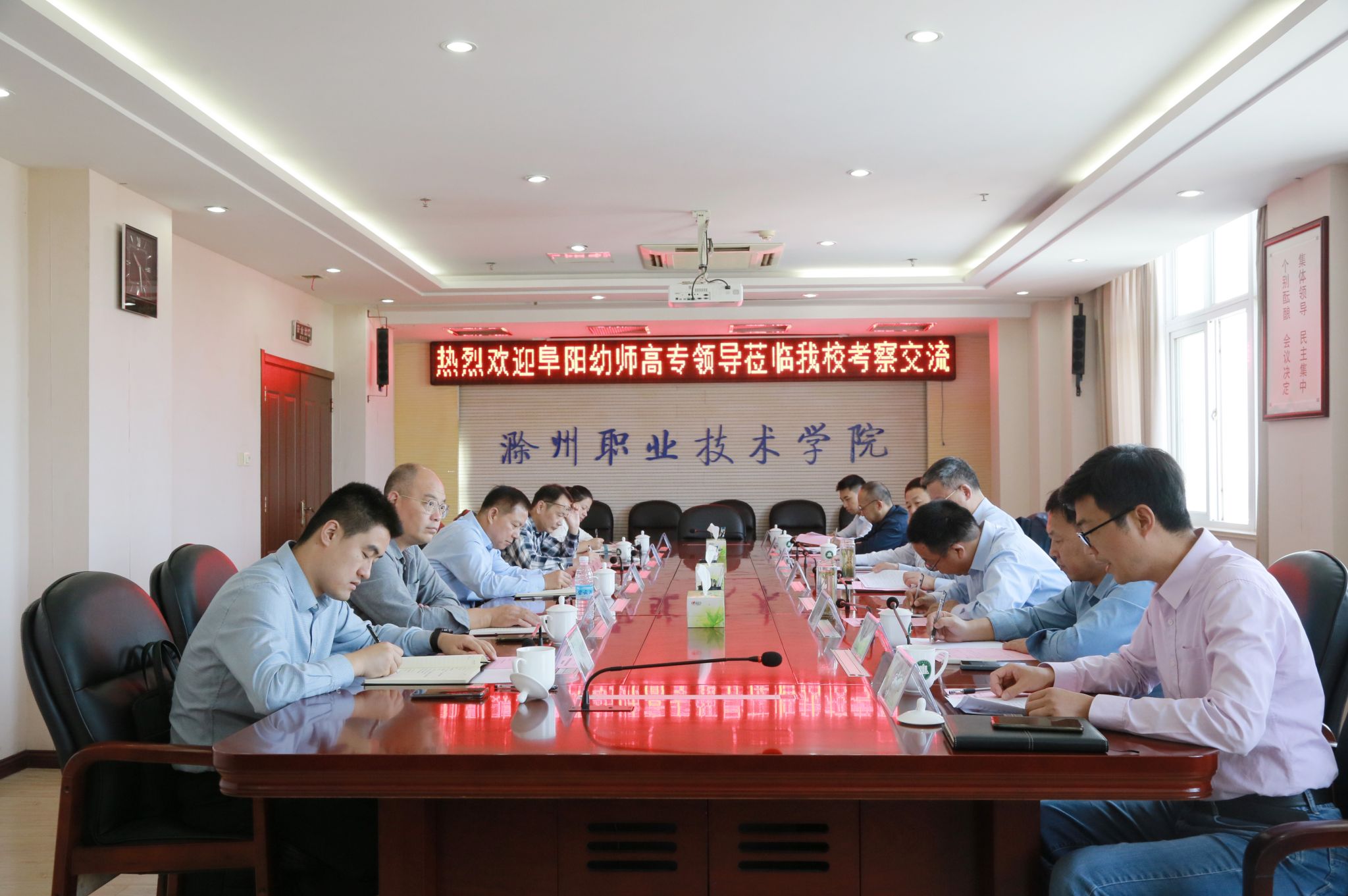 10月17日上午,阜阳市人大常委会副主任、阜阳幼儿师范高等专科学校党委书记金杰一行来beat365考察,就“三全育人”综合改革、“一站式”学生社区建设、“第二课堂”建设等方面展开交流。beat365党委书记曹付忠,党委委员、工会主席李平权陪同考察。校办公室、宣传统战部、学生工作处、团委、马克思主义学院等部门负责同志参与交流活动。