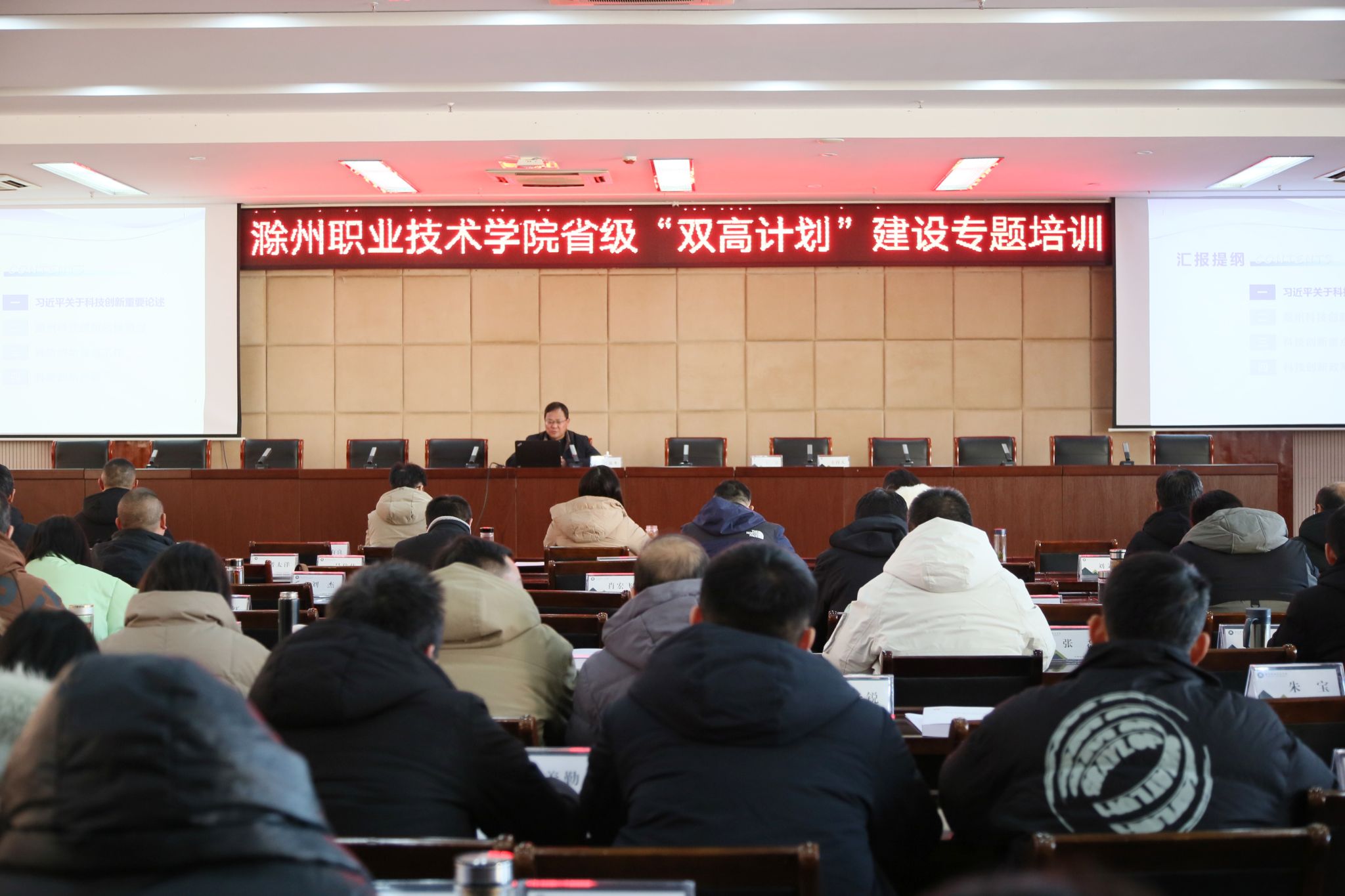 为统一思想,加强认识,加快推进“双高校”建设,对标建设任务,提升学校科技创新水平,打造技术技能创新服务平台,1月23日下午,beat365邀请滁州市科技局党组成员、副局长吴流水在5楼会议室作专题讲座,校领导、各部门正副职、教学院部党政正副职、系(教研室)主任、专业负责人、教授聆听了讲座。讲座由校党委委员、组织人事处处长王宇主持。