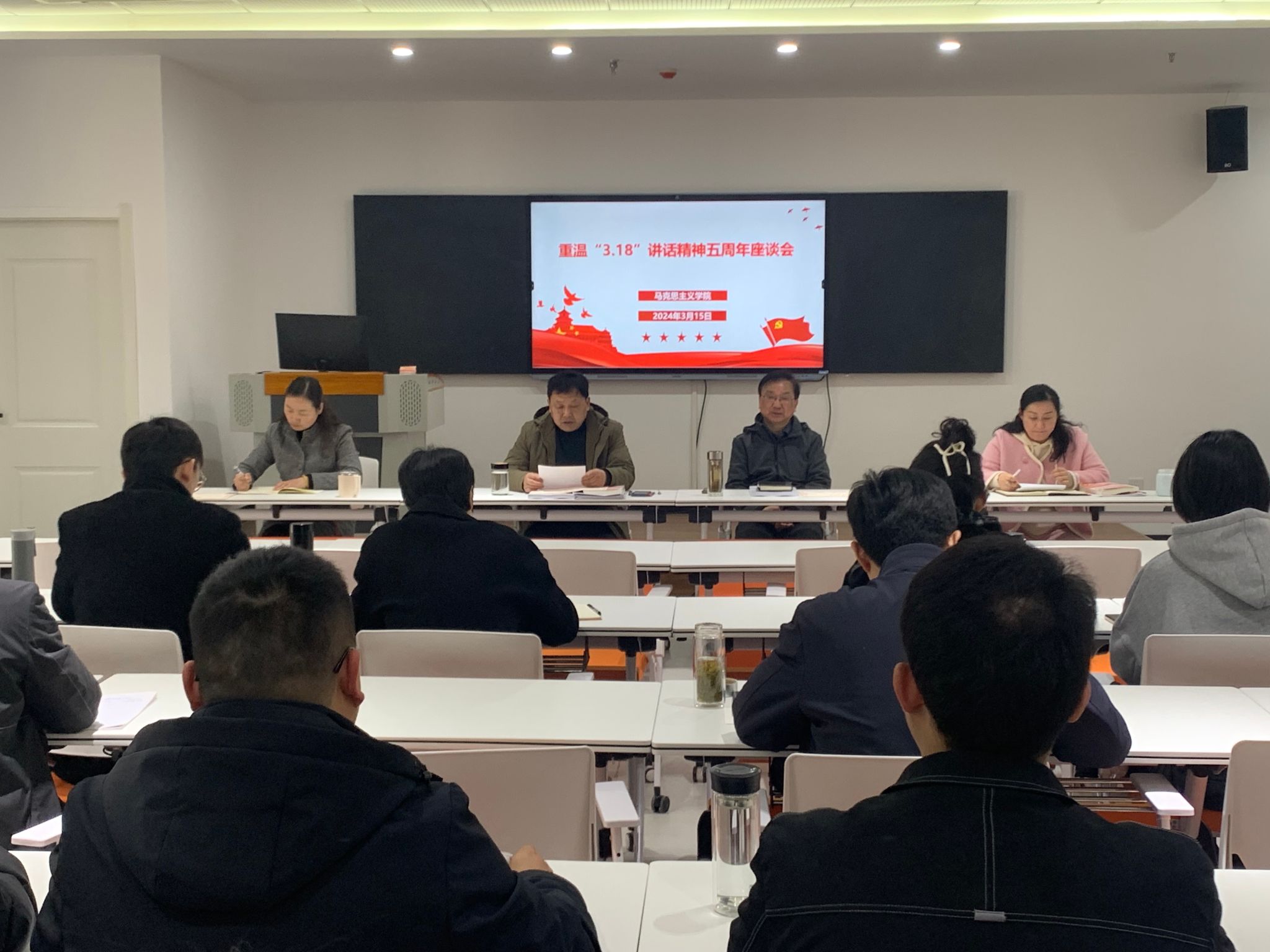 为进一步学习贯彻习近平总书记“3·18”重要讲话精神,3月15日,学校在综合楼309召开了“学习贯彻落实习近平总书记3·18重要讲话精神五周年座谈会”,校党委委员、宣传统战部部长王冬出席会议。会议由马克思主义学院副院长张家莉主持,全体专兼职教师参会并认真开展研讨交流。