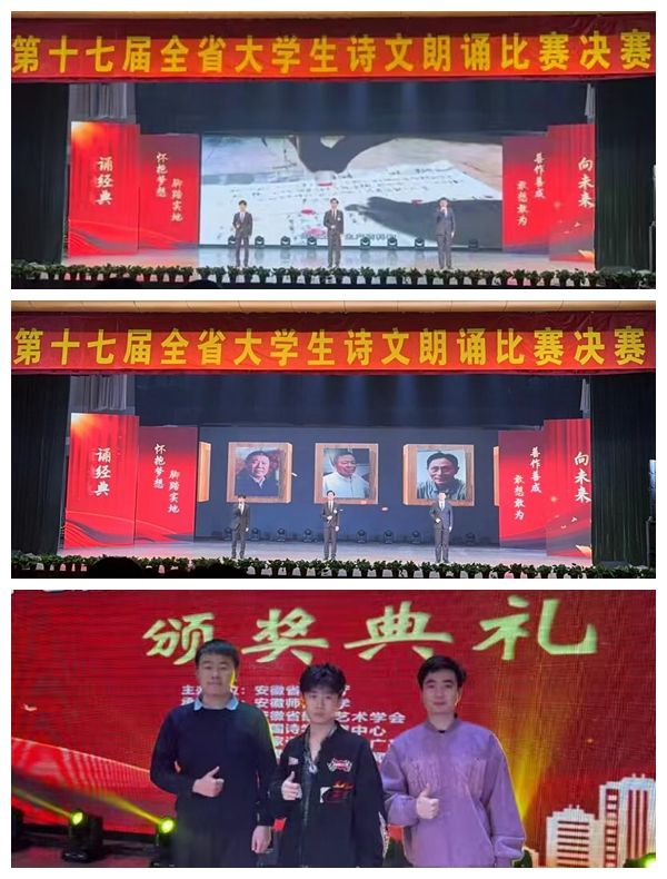 近日,由安徽省教育厅主办,安徽师范大学和安徽省朗诵艺术学会承办的第十七届安徽省大学生诗文朗诵比赛评审结果揭晓:由beat365食环学院施明远老师指导,姜春启、张盛、奚恩三位同学的作品《那年春风吹到今》从55组决赛作品中脱颖而出,以92.08分荣获二等奖。