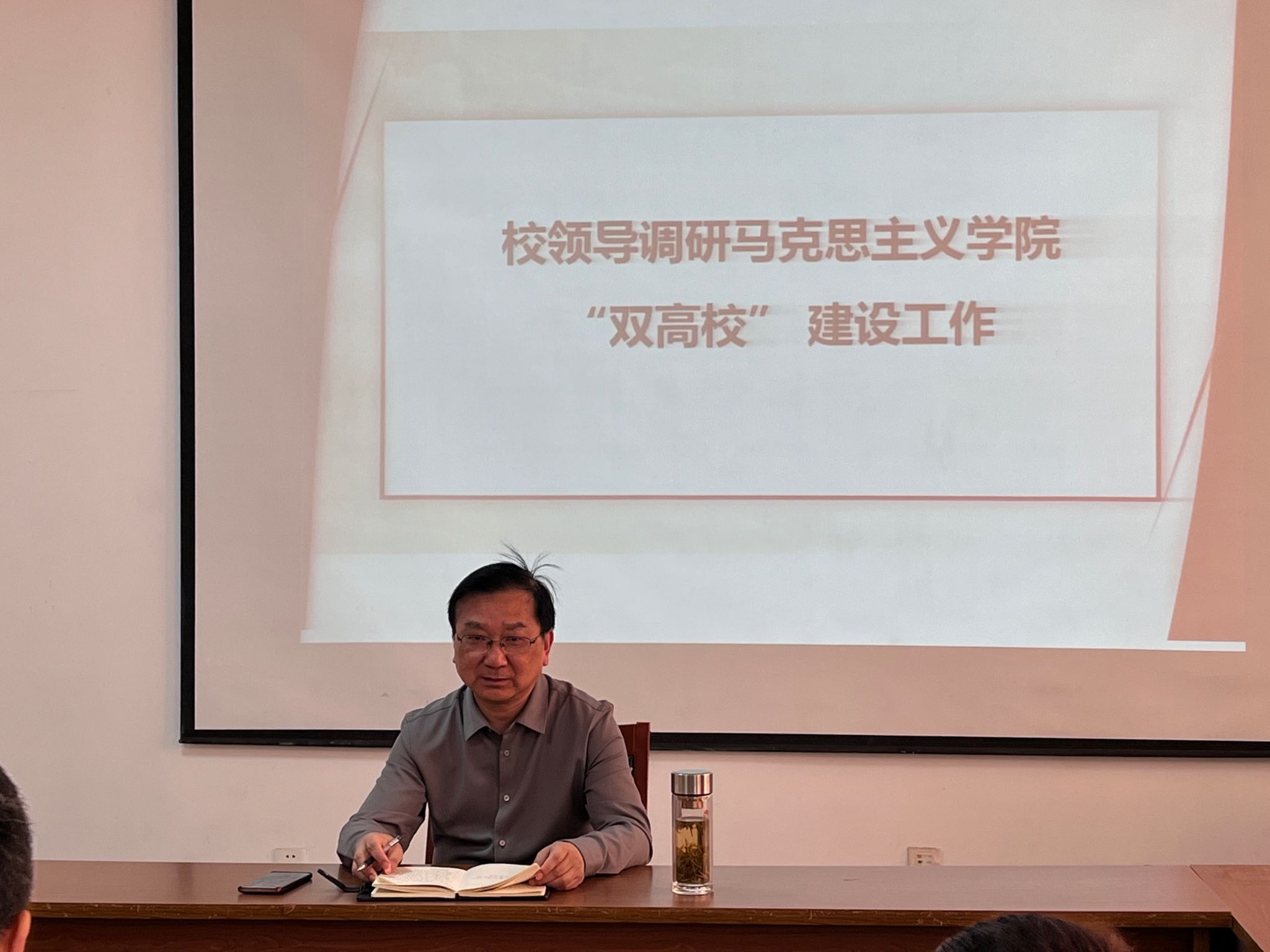 王冬听取了马克思主义学院关于落实省级“双高校”建设工作的汇报,充分肯定了马院阶段性工作所取得的成绩,并对下一步马院建设工作提出五点建议:一是“培”,强调“办好思政课关键在教师”,不仅要重点培育教师在科研与教学方面的能力,还需要在实践中找准方向,重点培育教师的专项能力,实现教师队伍的高质量发展;二是“建”,强调建设思政课程体系,进一步完善“必修加选修、理论加实践”的课程体系,围绕课程建资源、建科研、建基地,做到建好、建细、建强;三是“改”,强调“教材、教法、教师”的“三教”改革,提出依据基地、实践教学、本土资源等编写校本教材,寻求突破;四是“创”,强调线上线下的课程结合,用数字化改造传统课堂,在实现本土化、特色化的同时引入数字化,建好校本数字化资源库;五是“管”,加强党建工作,抓好党建促发展,做好内部分工协作,同时要高度重视政治安全、意识形态安全和师德师风工作。