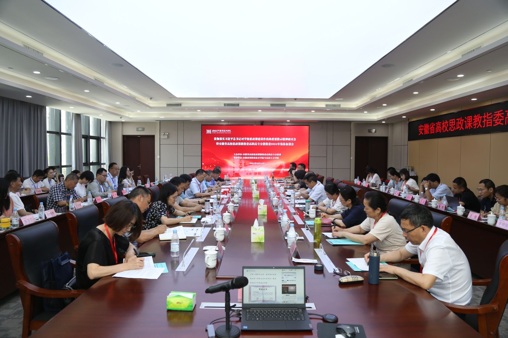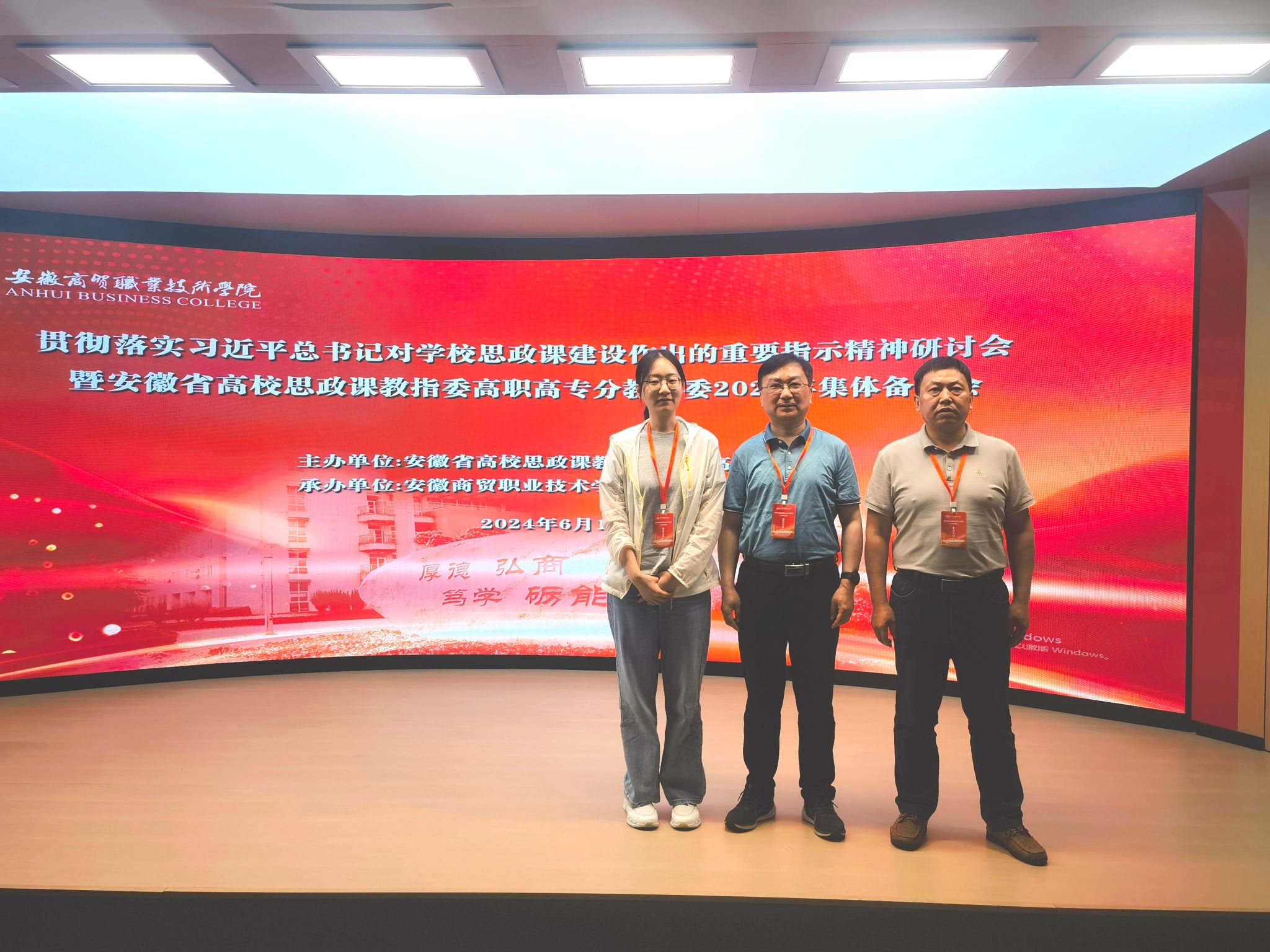为深入学习贯彻习近平总书记对学校思政课建设作出的重要指示精神,全面推进“习近平新时代中国特色社会主义思想概论”课程建设,2024年6月14日,由安徽省高校思政课教指委高职高专分教指委主办的专题研讨暨集体备课会议在安徽商贸职业技术学院召开。beat365党委委员、宣传统战部部长王冬带队,马克思主义学院院长孔金和青年思政课教师李明欣参加了本次会议。