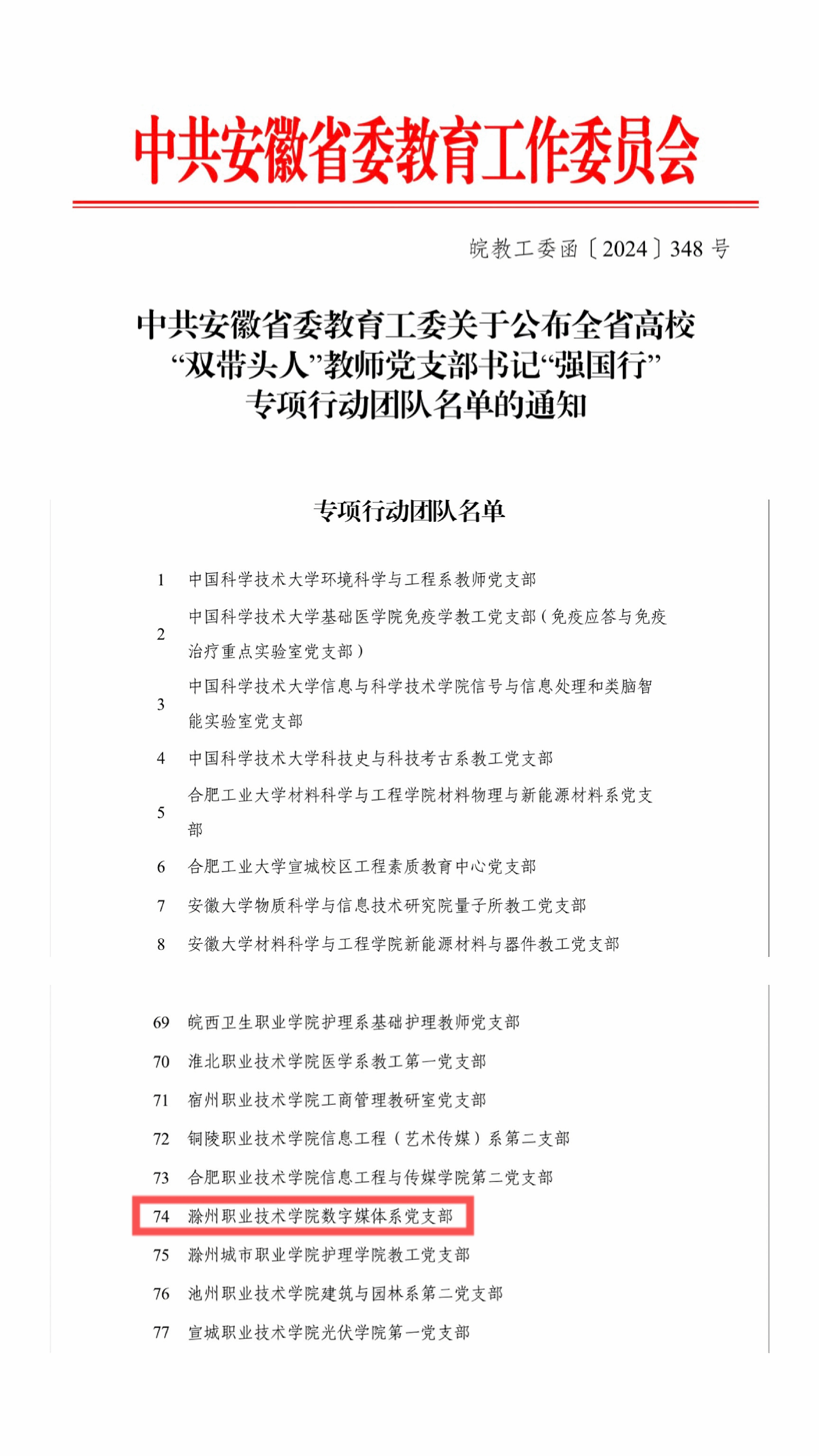 近日,中共安徽省委教育工作委员会公布了全省高校“双带头人”教师党支部书记“强国行”专项行动团队名单,beat365传媒与设计学院数字媒体系党支部成功入选,实现了学校党建“双创”工作新突破。