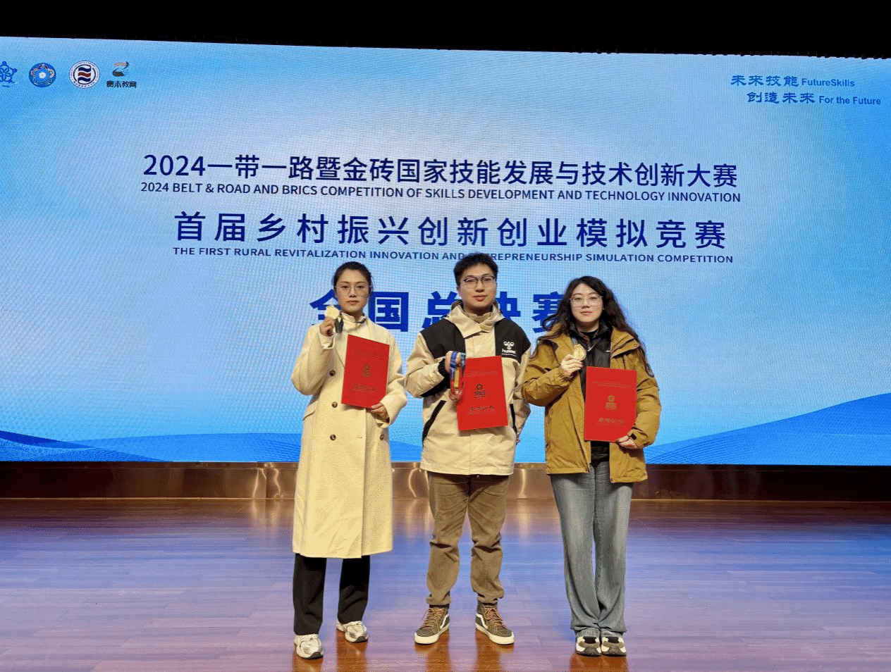 11月24日,2024“‘一带一路’暨金砖国家技能发展与技术创新大赛”首届乡村振兴创新创业模拟竞赛全国总决赛在杨凌职业技术学院举行,beat365商学院的喻瑶、王福盛、徐梦月三位教师,荣获全国总决赛职工组三等奖。本次大赛由金砖国家工商理事会中方理事会、“一带一路”暨金砖国家技能发展国际联盟、中国科协“一带一路”暨金砖国家技能发展与技术创新培训中心联合主办。