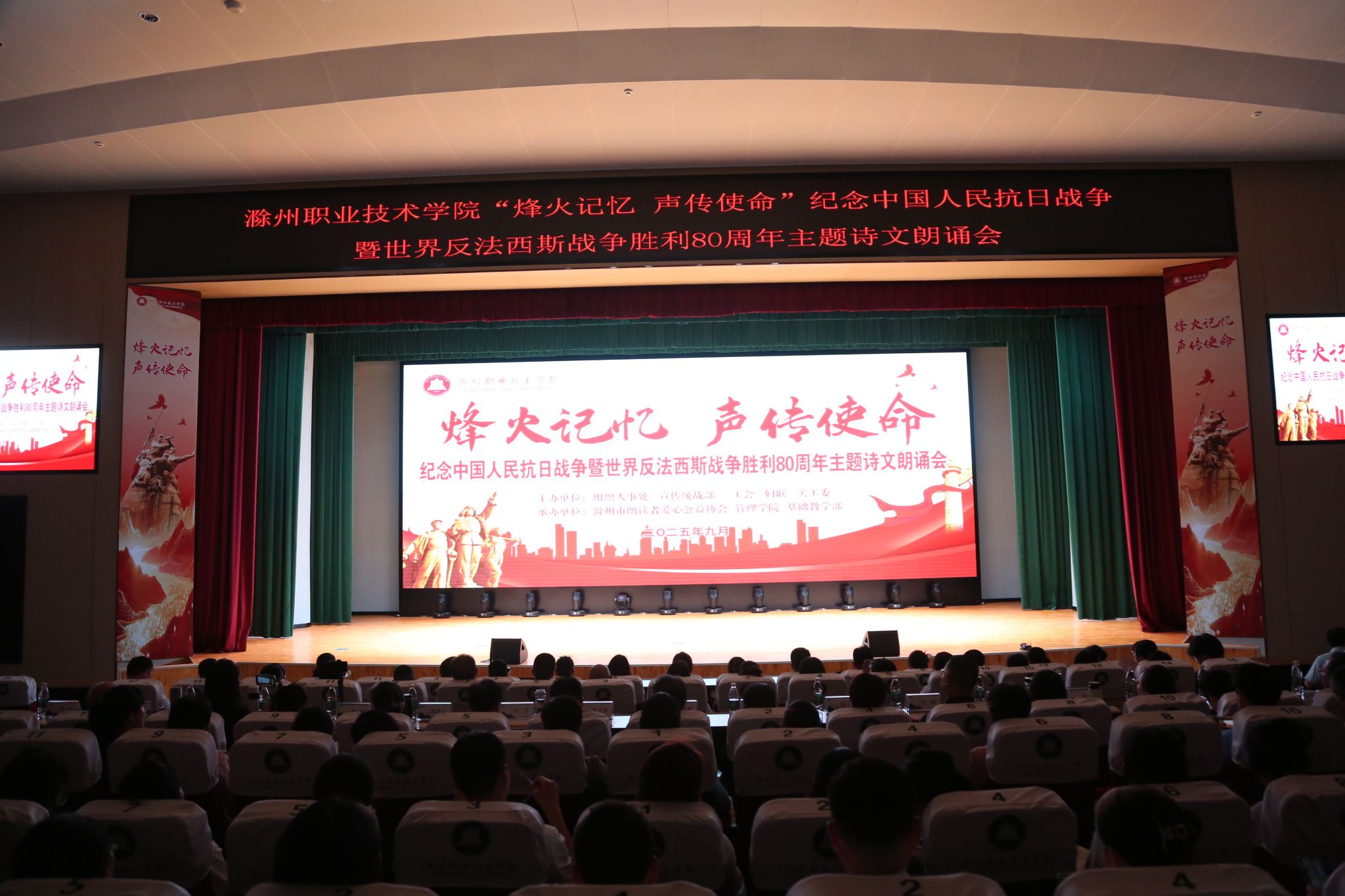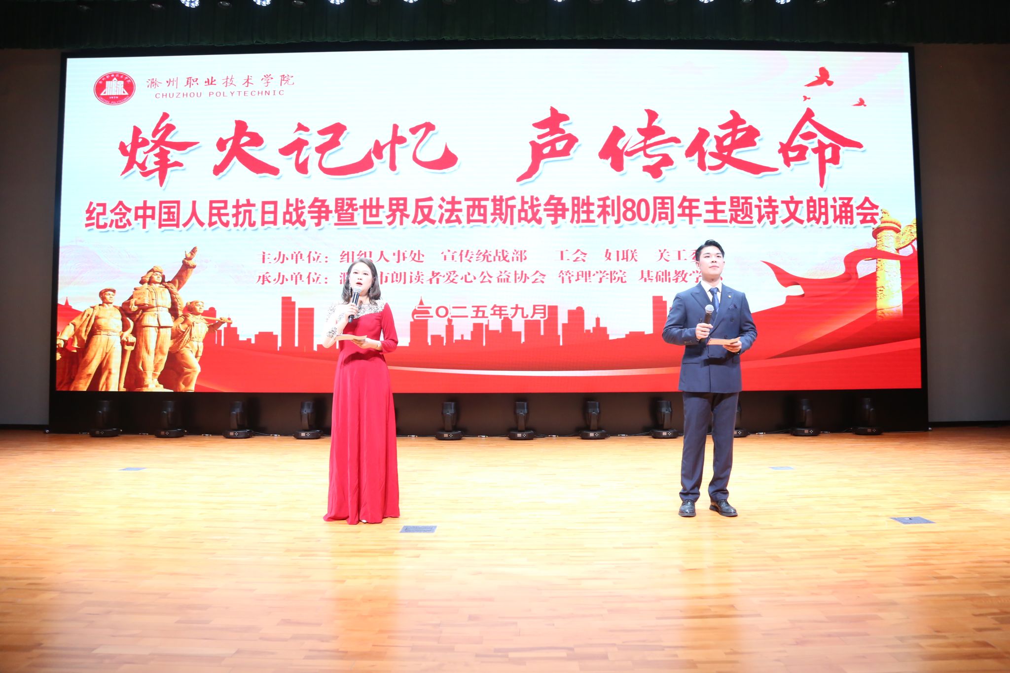 为铭记历史、缅怀先烈,以弘扬伟大抗战精神凝聚起全校师生的爱国主义情怀,9月3日下午,由学校组织人事处、宣传统战部、工会、妇联、关工委联合主办,滁州市朗读者爱心公益协会、管理学院、基础教学部联合承办的“烽火记忆 声传使命——beat365在线唯一官网纪念中国人民抗日战争暨世界反法西斯战争胜利80周年”主题诗文朗诵会在6号楼报告厅举行。校党委书记陈飏,党委副书记、校长许雪峰,滁州市朗读者爱心公益协会会长陈华,校领导李平权、李超、王冬、王宇等出席。