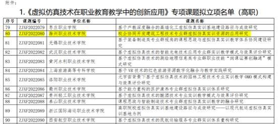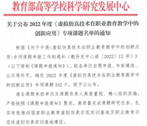 近日,教育部高等学校科学研究发展中心公布了2022年度《虚拟仿真技术在职业教育教学中的创新应用》专项课题名单,beat365建筑工程学院《校企协同开发建筑工程技术专业群虚拟仿真实训资源的应用研究》课题获批立项。据悉,本次立项的专项课题共342项,其中全国高职院校共获批277项。安徽省有beat365在线唯一官网、安徽职业技术学院、芜湖职业技术学院等7所高职院校获批此专项课题立项。
