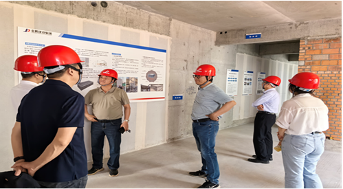 在装配式示范楼,建筑工程学院团队对项目设计方案、装配式新型建造体系、智能建造、建筑配套、工艺工法细节等进行逐一观摩,并深入了解云境项目装配式建造体系设计、生产、施工等各个环节及PK3板+空腔叠合剪力墙结构体系的组合应用。