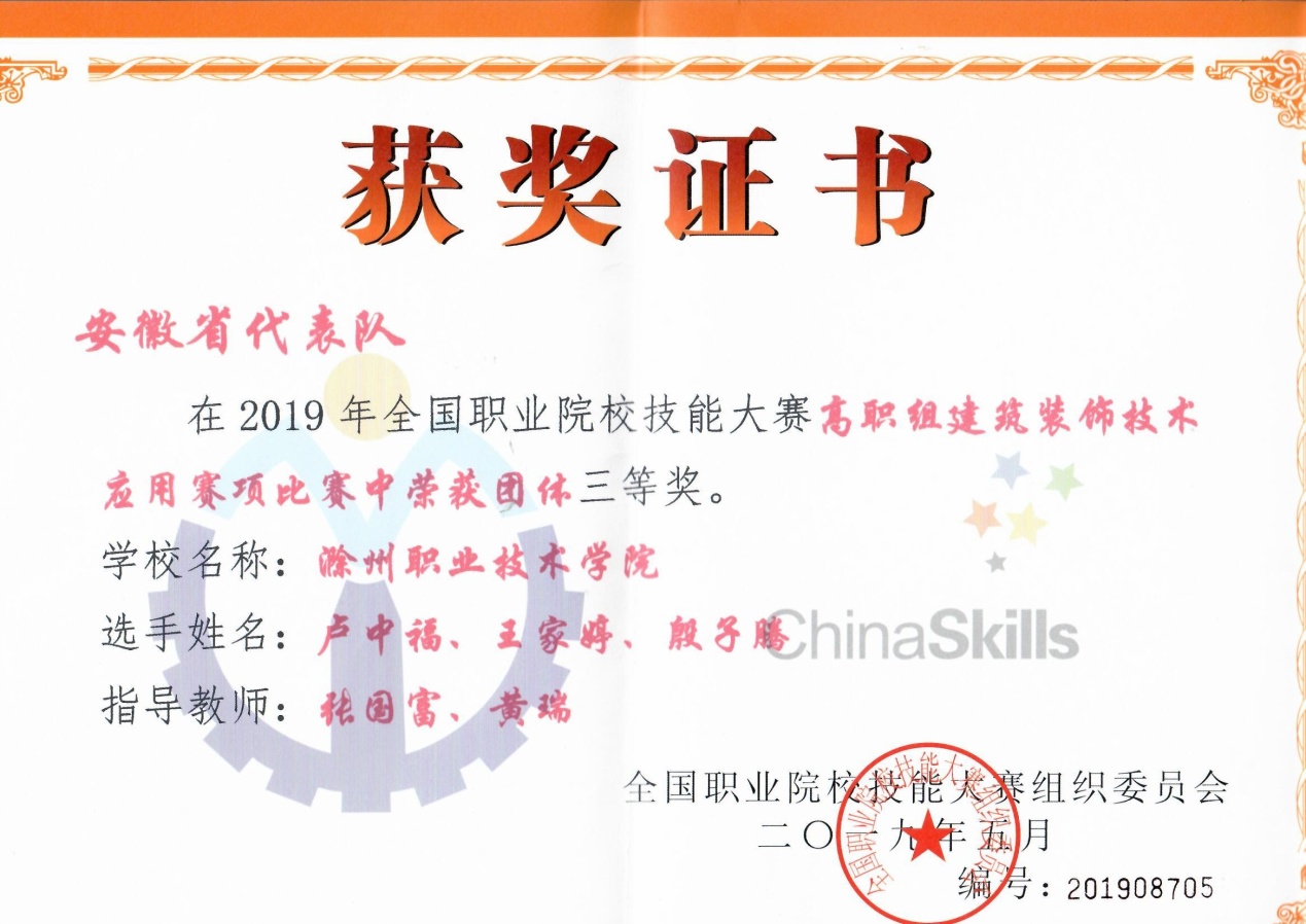 5月31至6月2日,2019年全国职业院校技能大赛高职组“建筑装饰技术应用”赛项在浙江建设职业技术学院举行,共有来自全国28个省市的79支代表队参赛。beat365土木工程系和传媒工程系组建的以王家婷、卢中福、殷子腾为选手,张国富、黄瑞为指导教师的代表队,经过激烈角逐,荣获团体三等奖。